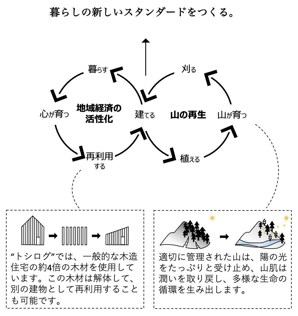 「都市型ログハウス(トシログ)®」とは、ログハウスの住み心地(無垢の木のぬくもり)を、都市の多様な住環境にふさわしい性能とコストで再定義し、循環経済に繋がる仕組みをデザインした建物です。 “トシログ” という愛称で、このプロジェクトを育てています。